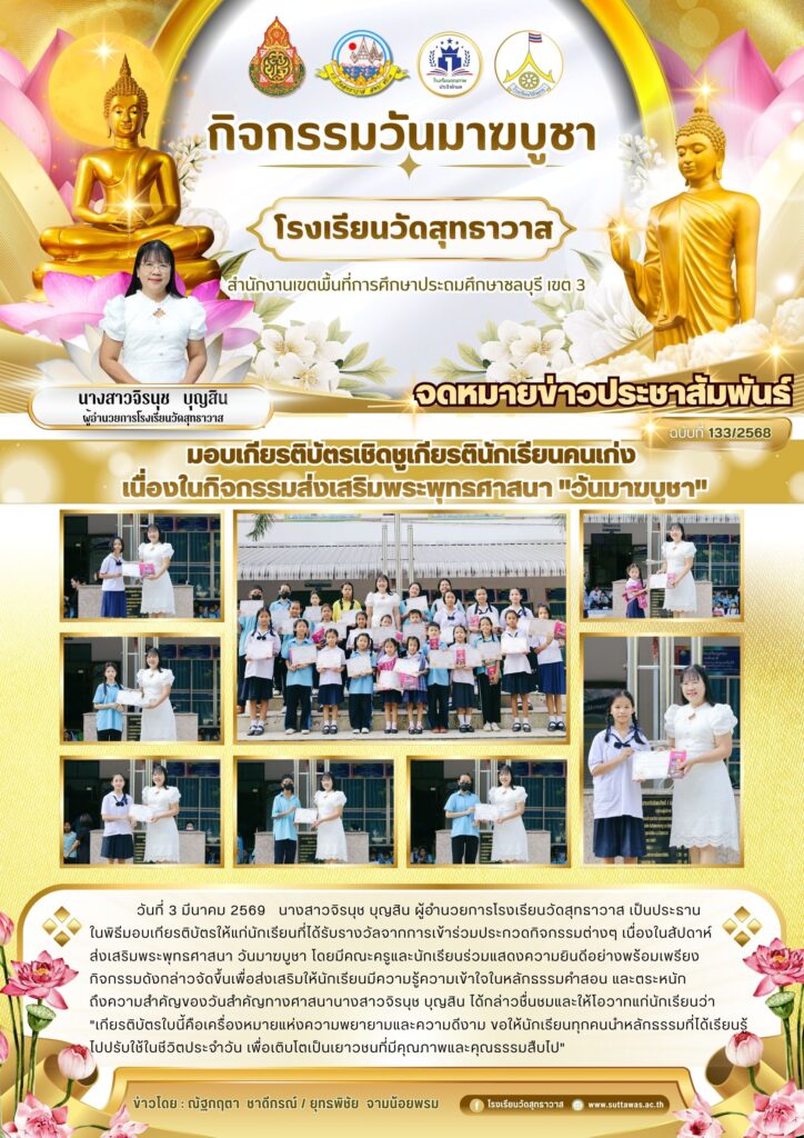 ผู้อำนวยการโรงเรียนวัดสุทธาวาสมอบเกียรติบัตรเชิดชูเกียรตินักเรียนคนเก่ง เนื่องในกิจกรรมส่งเสริมพระพุทธศาสนา “วันมาฆบูชา” กิจกรรมของโรงเรียน / Nataya Phosri ผู้อำนวยการโรงเรียนวัดสุทธาวาสมอบเกียรติบัตรเชิดชูเกียรตินักเรียนคนเก่ง เนื่องในกิจกรรมส่งเสริมพระพุทธศาสนา “วันมาฆบูชา” Read More »