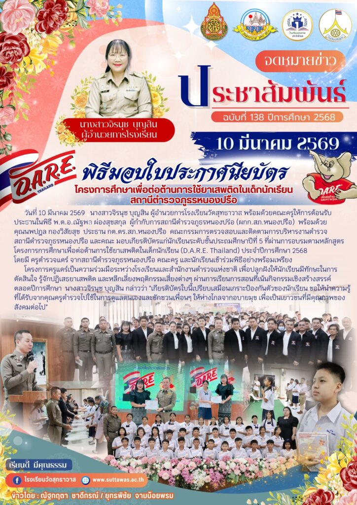 ผู้อำนวยการโรงเรียนวัดสุทธาวาสพร้อมด้วยคณะครูเข้าร่วมพิธีมอบใบประกาศนียบัตร D.A.R.E