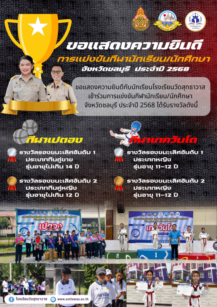 โรงเรียนวัดสุทธาวาสขอแสดงความยินดีกับนักเรียนในการแข่งขันกีฬานักเรียนนักศึกษา จ.ชลบุรี ประจำปี 2568