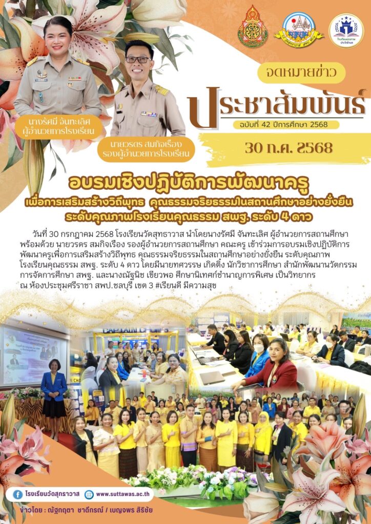 โรงเรียนวัดสุทธาวาสร่วมอบรมเชิงปฏิบัติการพัฒนาครูเพื่อการเสริมสร้างวิถีพุทธ คุณธรรมจริยธรรมในสถานศึกษาอย่างยั่งยืน ระดับคุณภาพโรงเรียนคุณธรรม สพฐ.ระดับ 4 ดาว